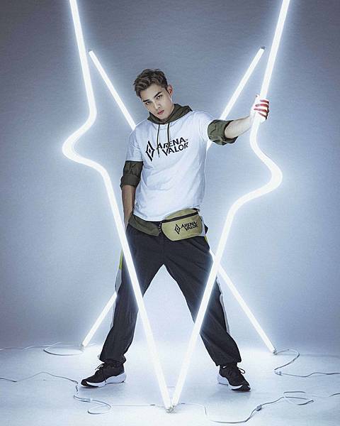 ▲以墨綠色連帽上衣外搭傳說對決「ARENA OF VALOR」經典標語的聯名白T,背後「團戰有你在,勝負都精彩」的經典團戰精神,