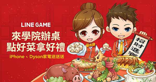 農曆新年假期即將到來,過年就來LINE GAME學院和學長姊一起辦桌吧!完成辦桌點菜任務,iPhone 11 Pro Max、Dyson系列家電、LINE POINTS、LINE GAME獨家新年手機桌布等大獎通通送給你!