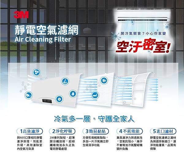 美國環境保護署(EPA)的報告指出,室內空氣汙染程度通常比室外空氣高2到5倍,室內空汙可能因為空氣不流通與人口密集而更加嚴重,建議可藉由室內循環設備(冷氣、清淨機、除濕機)加裝靜電濾網,無論是夏天的冷氣使用期間,抑或是梅雨季開除濕,都能加強室內空氣濾淨,同時透過靜電濾網吸附空氣中的帶菌微粒、塵螨過敏原及PM2.5…等污染原,多一層靜電空氣濾網的防護,讓在室內呼吸更安心。