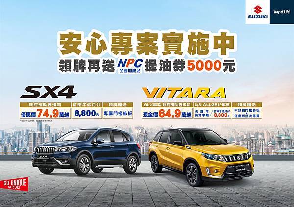 10. 現金優惠價64.9萬元起為VITARA GLX車款,並獲得政府補助貨物稅減免後之金額。