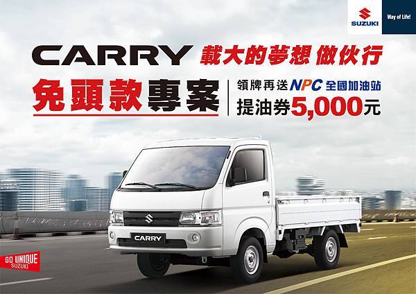商用車CARRY,TAIWAN SUZUKI也提供免頭款專案,