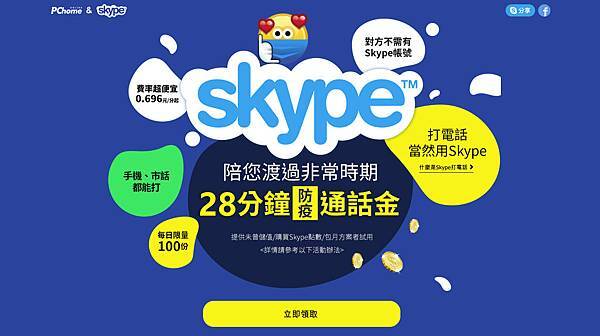 - 領取對象:未曾於PChome & Skype 購買或儲值Skype點數或包月型方案等付費產品之用戶。