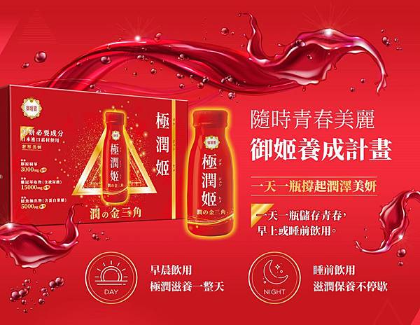 美容飲知名品牌-御姬賞,今年推出了重磅新品-御姬賞極潤姬,小小一瓶含有膠原精華3000mg (台灣獨家技術萃取膠原蛋白),雞冠萃取物含玻尿酸15000mg*和添加鮭魚抽出物(含蛋白聚醣) 5000ug,並以獨家萃取技術精純液態好吸收,整體配方還含有多國專利,一天一瓶撐起潤澤美妍。