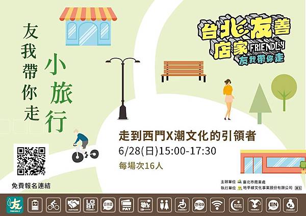 臺北市商業處表示,為帶領民眾體驗本市商圈友善店家提供的友善服務及商圈特色,將於109年6月至8月期間推出西門、民生社區、心中山線形公園、永康及天母等商圈7個場次,友善店家小旅行體驗活動,每個場次都邀請到專業導覽員文史解說,結合台北友善店家遊訪,讓民眾更能深入體驗台北的文化歷史與友善店家特色,以形塑本市為友善之都。首場「友我帶你走」-「走到西門X潮文化的引領者」即日起開始報名至109年6月22日止,並於109年6月28日登場,限額16名,歡迎喜歡分享生活體驗者踴躍報名。