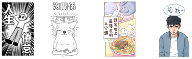 炸出百分之兩百情緒的表情浮誇系:擅長使用近年最夯的網路用語搭配浮誇的表情「屁孩時代」、幽默逗趣的畫風貼近生活的內容「某人日常」,一張大貼圖,就能瞬間炸出超滿情緒,浮誇當道喜怒哀樂大聲 「貼」出來!