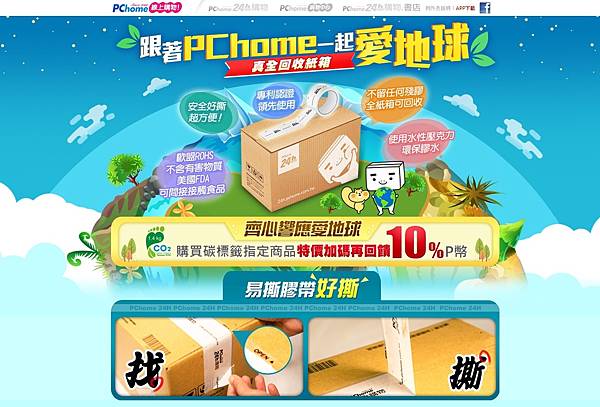 為更進一步推廣綠購計畫,PChome網路家庭於今年成為全台第一家取得「碳標籤」之大型綜合網購平台,藉由揭露及分析產品碳足跡,了解產品於每個階段所產生之溫室氣體比例,進而探討減碳策略,發展綠色供應鏈,也鼓勵消費者可優先選購具碳標籤的產品,並於產品使用及處置時,共同降低碳排放,達到愛護地球的目標。此外,為持續深耕綠色經濟,網家亦獨家上線新款易撕膠帶,膠帶材質使用水性壓克力環保膠水,主打環保安全、方便易撕,且經歐盟RoHS、美國FDA等國際認證,不含有害物質、可間接接觸食品,消費者於回收紙箱時,不僅能快速撕取膠帶本體、不留任何殘膠,更能達成紙箱100%回收的環保理念,實踐友善環境行動。