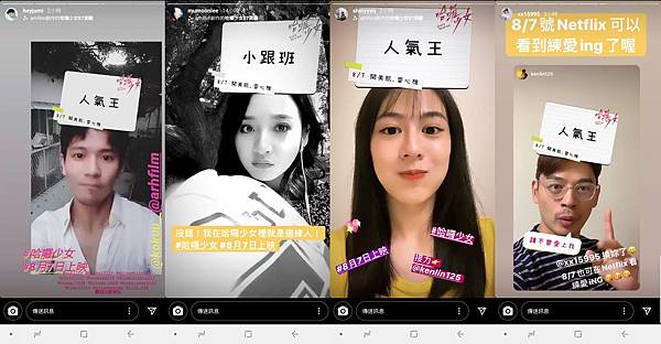 追隨高中學生最愛使用IG反映現在的動態與心情,【哈囉少女】也設計了一款免費的 IG 濾鏡,測驗你是人氣王、牆頭草、邊緣人、傻白甜還是人氣王,也吸引演員們紛紛在限時動態發布自己的測驗結果。在戲中相敬如冰的王渝屏與陳怡叡,玩出的結果不約而同都是風吹兩邊倒的「牆頭草」角色!戲中的人氣王林輝瑝則玩中「傻白甜」,自拍照片竟也非常吻合這個好傻好天真的描寫,自帶笑果!宋柏緯、劉主平則跟戲中角色很相近,玩出了「邊緣人」結果,劉主平還開心標注「邊緣就是讚」!戲中心直口快的姚亦晴則玩中了「人氣王」結果,還點名阿Ken(林暐恆)也來玩!也玩中「人氣王」的阿Ken更不忘趁機提醒自己導演主演的電影《練愛iNG》Netflix 上線日也跟【哈囉少女】上映日期一樣,都在明天。其他演員包括李沐、冉竣文等人也都開心玩起濾鏡,力推自己參演的新片!濾鏡效果可至双喜電影 IG(@arhfilm)「哈囉少女87測驗」免費使用。
