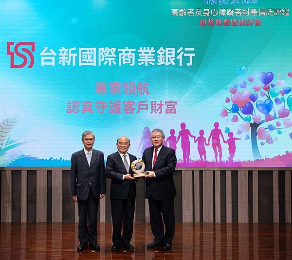 (2020/08/28)金管會為因應臺灣人口高齡化發展趨勢,自2016年起每年對銀行展開相關政策推動評鑑及獎勵。昨(27)日舉行第四屆信託業辦理高齡者及身心障礙者財產信託評鑑頒獎典禮,由行政院院長蘇貞昌親臨頒獎。台新銀行總經理尚瑞強於代表出席領獎表示,該行在此次評鑑中居民營銀行之首,積極響應政府政策獲政府肯定,也彰顯台新銀行的專業與體貼服務值得民眾信賴。