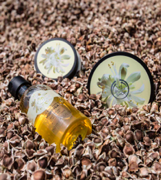 The Body Shop辣木籽更新緊緻系列蘊含來自社區公平交易盧安達辣木籽油,經人手摘取被稱為奇蹟之樹─辣木豆莢內的種子,再以冷壓方式萃取,以防高溫破壞其營養成分。辣木籽油含豐富的脂肪酸,能重建肌膚屏障,深層滋潤,防止肌膚乾燥及水分留失,讓肌膚維持平滑柔軟,並具高度的抗氧化效果。