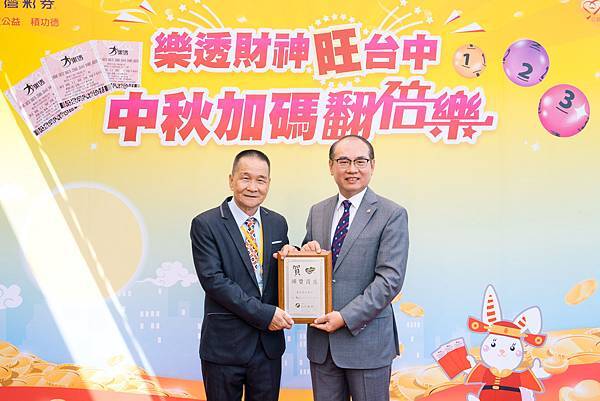 台灣彩券公司總經理蔡國基表示,臺中市真是幸運的寶地,今年「大樂透」開出的12次頭獎中有5次是在臺中市開出,幸運抱走「來富貴彩券行」開出頭獎1.28億元的幸運兒是臺中當地的中年男性上班族,平常就有買彩券的習慣,當期用電腦選號買了10注「大樂透」,其中1注讓他幸運中了頭獎。蔡國基總經理也呼籲民眾把握中秋加碼好時機,今晚開獎的「大樂透」將加開81組100萬元,今年還創新增開獎金倍數球,每組100萬獎金有機會翻成200萬、300萬。民眾購買中秋加碼的「大樂透」,除了可以對例行開獎的頭獎至普獎獎項外,還可以再對增開獎金倍數球的加碼100萬元獎,等於買一張可以對兩個獎項,100萬獎金還有機會翻倍。