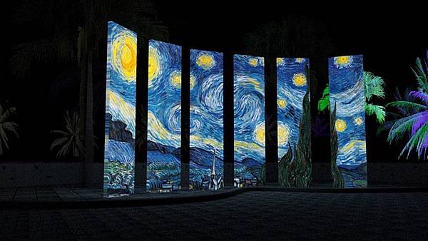 展區之一的「星空下的畫布」以梵谷《星夜》為發想主題,運用現代科技,展現作品真實且強烈的色彩,揮灑出一幅美麗的畫。「星空下的詩人」則以杜牧名作「天階夜色涼如水,臥看牽牛織女星」為發想,藉由各種七彩的燈飾,打造出如同牽牛織女間的鵲橋星廊,讓遊客能在閃耀的星廊之下盡情攝影。