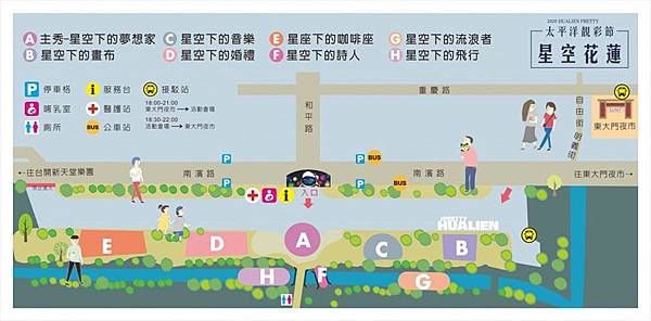 活動期間除了光影裝置藝術,每日還有兩場主題舞蹈表演。每周五、六、日則推出多項親子活動,讓大小朋友都可以在星空下同樂。而為讓民眾便利的前往會場,期間還將提供免費交通接駁車。