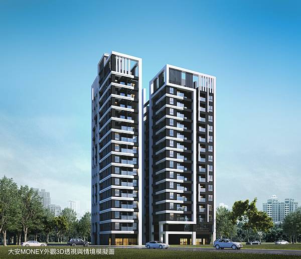 (大安MONEY以鑲嵌名琴琴鍵為設計靈感,雙塔建築規劃顯露出地標氣勢。)