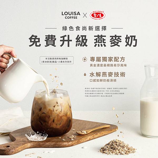 即日起~12/31於全台路易莎咖啡館,不加價即可同步品嚐純濃燕麥-咖啡師燕麥奶所特調出的咖啡/紅茶燕麥奶系列,今年冬日最暖心的嚐鮮敬勿錯失。