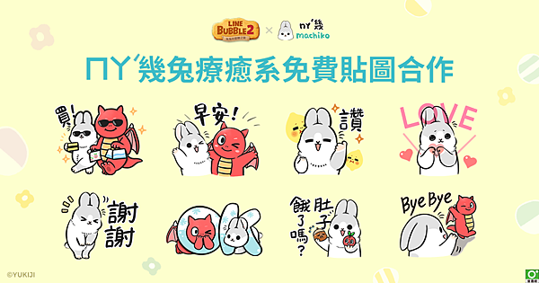 LINE GAME 旗下消除泡泡益智手遊《LINE Bubble 2》,今(23)日宣布推出與台灣超人氣原創插畫家YUKIJI所繪製的貼圖角色『ㄇㄚˊ幾兔』展開免費貼圖合作活動囉!軟萌可愛的『ㄇㄚˊ幾兔』與LINE Bubble 2 裡的人氣角色火龍『尼可』將化身療癒又實用的貼圖免費送給你!用戶只需下載《LINE Bubble 2》 並完成遊戲內的指定貼圖任務,就可以輕鬆入手合作免費貼圖,喜歡『ㄇㄚˊ幾兔』的粉絲們千萬不要錯過本次的期間限定合作喔!