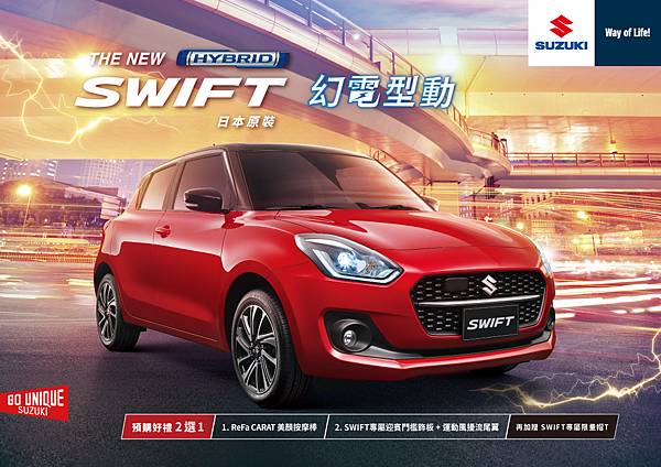 此次,THE NEW SWIFT搭載MILD HYBRID輕油電科技,以及SUZUKI Safety Support的安全升級,將以全面革新之姿強勢回歸台灣車壇,以SUZUKI「GO UNIQUE」的品牌精神,持續為台灣消費者帶來不凡的魅力生活。