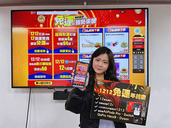12月人人最高皆可領12張免運券,除了基本的四張免運券外,每個禮拜一再加碼,並於 12/11~12/13 這三天加碼再加碼,天天都可領取免運券好康,且12月12日當日12點及20點共兩個時段推出限量獨家折扣碼,消費現折$1,212;另外,露天拍賣年末大放送,消費即可登記抽大獎,共推出三項抽獎活動。