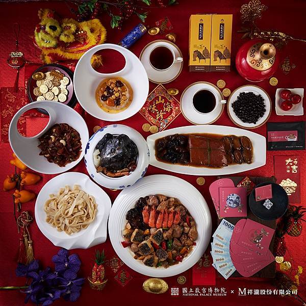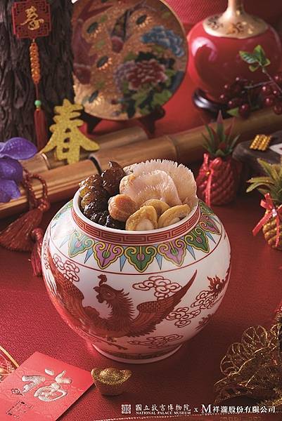 PChome 24h 購物開賣國立故宮博物院與祥瀧股份有限公司雙品牌年菜料理,其中「朕的年菜」取材史卷記載的過節風俗,強調「讓每道年菜都有圍爐守歲的溫度」,精心設計雙蔘如意金翅烏雞、鳳翔魚躍、細火煨東坡佐九孔鮑等,六道象徵富貴添壽的佳餚,適合 6-8 人份圍爐聚餐,更巧妙搭配甜品、咖啡、骰子、紅包等守歲包,作為年菜組中的附贈亮點,在茶餘飯後亦能分贈壓歲錢、擲骰子娛樂,促進溫馨享樂的守歲氛圍,更祈求來年平安順遂。而「朕的佛跳牆」取自清朝「霽青描金游魚轉心瓶」史物,外包裝以精巧的防水紙材製成,因此自家烹煮、走春送禮兩相合宜,湯品由排翅為主軸,搭配鮑魚、烏參、干貝等嚴選好食材,精煉成濃郁香醇的經典料理, 具「年年有今朝,歲歲長相見」的寓意,滿載新年百福具臻的祝福心意!