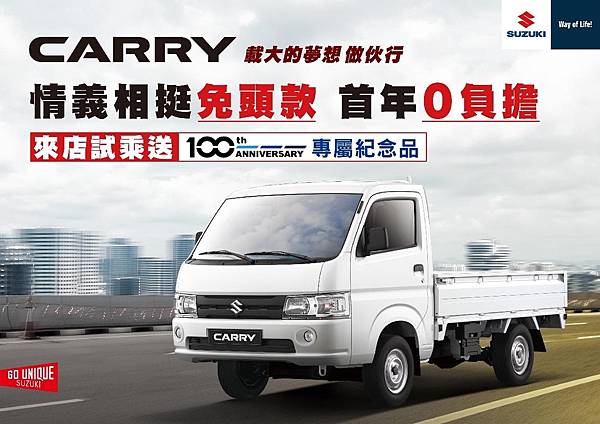 全新世代CARRY以超越同級的超大載重、節能油耗及靈活操控等堅強實力,獲得全台年輕創業頭家們的肯定。TAIWAN SUZUKI推出史無前例的超激優惠,入主CARRY不僅購車免頭款,更享等值首年月付額的萬元大紅包,獲得頭家們的熱烈迴響,本月優惠不間斷,力挺全民拼經濟,讓更多頭家輕鬆做生意。