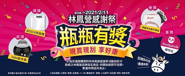 即日起至2021年2月11日止,於活動通路購買附有刮刮卡貼紙之指定商品(林鳯營鮮乳、林鳯營優酪乳、林鳯營特濃優格、林鳯營鮮奶優格),刮開貼紙即有機會獲得BOSCH洗碗機、Tefal特福氣炸鍋、中華職棒32 年味全龍限量門票組、foodpanda生鮮雜貨$100元購物金等獎項,保證瓶瓶有獎!