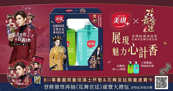 台灣知名沐浴品牌「美琪」與深受台港澳女性喜愛的古裝宮鬥遊戲《花舞宮廷》首次跨界合作!結合《花舞宮廷》年度代言人畢書盡限量贈品《美琪抗菌沐浴乳-花舞宮廷聯名限定組》於2021年2月底風靡上市,與你一起享受奢華沐浴香氛。