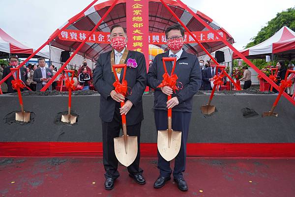 桃園市長鄭文燦(右)與聲寶集團總裁陳盛沺(左)執金鏟為為聲寶集團企業總部動土
