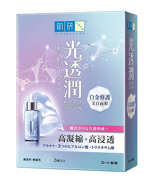 肌研光透潤白金修護面膜系列添加珍貴白金微粒,超細小分子不僅能快速深入肌底,強化滲透力,還能深層修護肌膚,維持肌膚健康平衡狀態,使保養精華能被完整吸收。此外,「肌研光透潤白金修護保濕面膜」嚴選4種玻尿酸-水解礦物玻尿酸、玻尿酸微囊球、保水玻尿酸、高效玻尿酸,不同大小分子玻尿酸能為舒緩肌膚乾燥粗糙,為肌膚補水鎖水、長效保濕,即使在冷氣房中,肌膚仍能整天水嫩透亮。「肌研光透潤白金修護美白面膜」則添加專櫃級雙重美白精華-傳明酸、PMS淨白因子,能有效抑制黑色素,改善肌膚蠟黃暗沉、斑點瑕疵、膚色不均等肌膚困擾,搭配3重玻尿酸-水解礦物玻尿酸、玻尿酸微囊球、高效玻尿酸,美白同時為肌膚注入水分,讓肌膚白得無瑕更淨透。