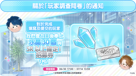 協助完成問卷的所有玩家將能獲得水晶30個與SR以上確定!招募券1枚作為回禮!