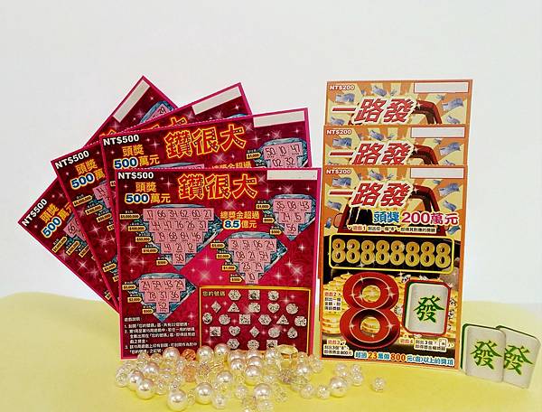 台灣彩券公司今(6)日推出2款刮刮樂新品「鑽很大」與「一路發」,要讓齊心抗疫減少出門的民眾,可以刮獎解悶挺公益。刮刮樂「鑽很大」每張售價新臺幣500元,票面佈滿閃爍光芒的鑽石呼應遊戲主題,耀眼奪目的鑽石更添尊貴及財富感,頭獎500萬元共有3個。刮刮樂「一路發」每張售價200元,票面為滿載金幣的發財車朝著漫天飛舞鈔票的天際前進,結合數字「8」和麻將牌「發」的遊戲區,傳遞好運一路發的好預兆,共有4個頭獎200萬元。2款新品總獎項超過223萬個,總獎金逾13億元(詳如【附表】)。