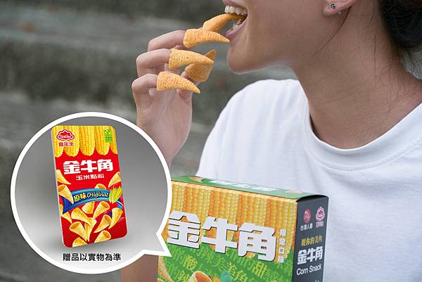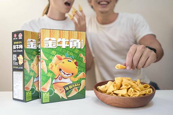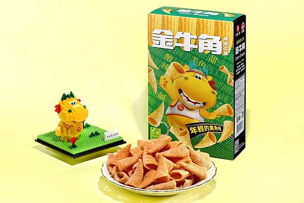 金牛角採用非基因改造玉米,濃郁的玉米香氣和獨特的牛角造型,不管大人小孩一定都試過套在手指上的經典吃法,全台全聯獨家販售限定口味的「年輕的美角味」,包裝上能看到熟悉的台灣阿龍以超萌啦啦隊造型,舉著金牛角,為台灣也替年輕世代一起加油,在這個時刻,給你滿滿能量、挺你的眉角!