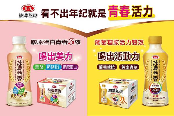 好喝好吸收的純濃燕麥Plus青春三效和活力雙效,每日各ㄧ瓶持續喝,想看不出年紀? 就是要全新的純濃燕麥高機能青春活力燕麥飲。