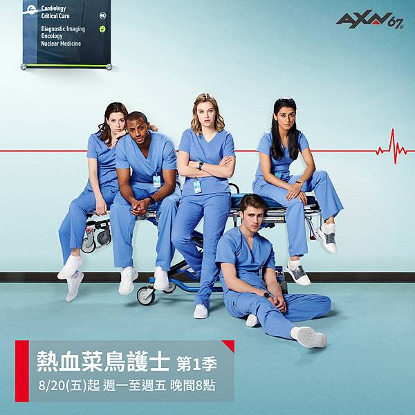 亞洲首屈一指的動作及實境冒險頻道AXN 67頻道,將於八月份全台獨家首播加拿大影集《熱血菜鳥護士》第一季,這部以「醫療」題材為主的影集,在加拿大首集播出即吸引約360萬觀眾同時收看,亮眼的收視成績好評如潮,加拿大製作公司已確定續訂《熱血菜鳥護士》第二季。全新正夯醫療題材劇《熱血菜鳥護士》第一季將於8月20日(五)起,每週一至每週五晚間8點,於AXN 67頻道全台獨播,各位醫療劇迷們千萬不能錯過!