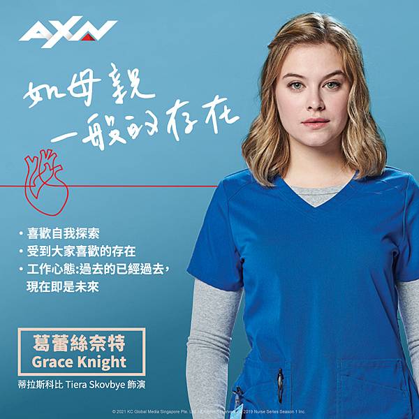 ● 葛蕾絲奈特:《河谷鎮》蒂拉斯科比(Tiera Skovbye),飾演在遇到一位被證明難以診斷的病人後,被迫面對自己過去的創傷且逐漸危及工作的菜鳥護士。因出演青少年懸疑美劇《河谷鎮》一炮而紅的她,在Instagram上擁有一百多萬粉絲,在沒有任何演藝家庭背景下,靠著不斷地試鏡最終獲得《熱血菜鳥護士》的主演機會。