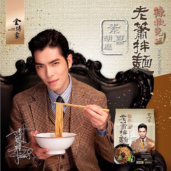 一直奔波各地忙碌演藝事業,閒暇時老蕭大多待在家裡陪伴毛孩,有時簡單煮碗麵大快朵頤就是他最愛的時光。愛護動物的心更推動老蕭想要開發全素商品,素食蔬食也是近年來健康取向飲食風潮。因此金博家在開發全素口味更全力以赴,屢經測試最終遠赴四川直接引進道地川味胡麻全素拌醬配方,有別於台式麻醬慣用豬油與雞粉提味,素喜胡麻拌麵靠著花椒的麻、青花椒的鮮香與獨門熬煉的醬汁,創造出獨具風格的川味胡麻口味,更加入芝麻與辣子讓每一口咬下爆發鮮香溫潤的口感與滋味,希望帶給大家有別於一般素食拌麵的美味感動。