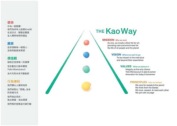 面對現今快速變化充滿挑戰的世界,花王集團以「花王之路(The Kao Way)」再次確立了全球花王人的共同使命「創建Kirei的生活方式,關懷並豐富全人類與地球的福祉」,對每個員工而言,「花王之路」也是工作上不可或缺的行動方針,藉此結合個人成長與公司發展,體會工作意義和生存價值。