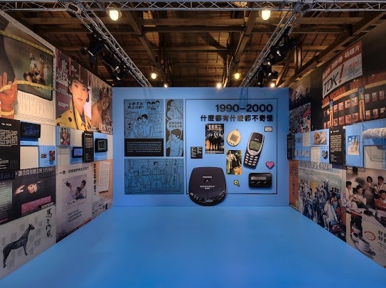 踏入展場,「懷舊書報攤」以復刻的報紙、宣傳海報、廣告單,再現日治時期繁華的都會生活。進入戰後臺灣,則是精心打造的6大展區,以廣告、老照片、電台廣播,搭配重製放大的復刻文物,為不同階段的臺灣社會「開箱」。與人等高的風格插畫,書寫著各年代的流行語,讓觀者一眼掌握時代氣氛。從50年代的報紙,充斥著標榜增胖多食的保健藥品廣告,反映了戰後生活的困頓;包裝搶眼的「寄藥包」,則訴說著醫療窘迫的年代,一包「便藥」就是小老百姓緩解疼痛的居家救星。