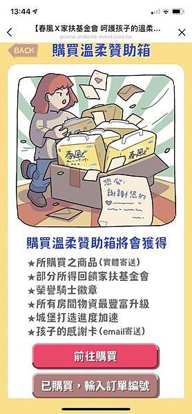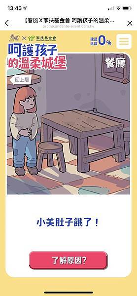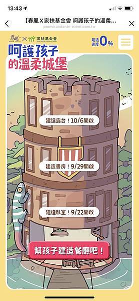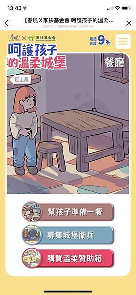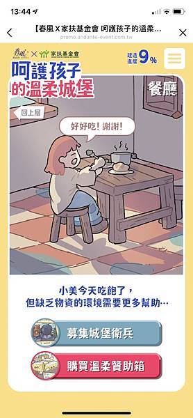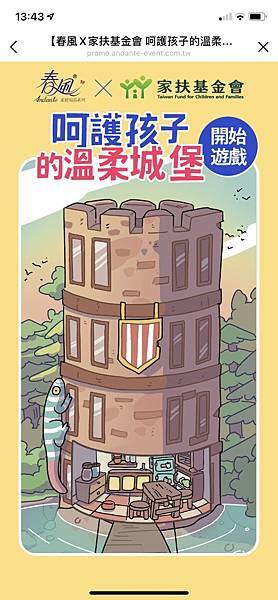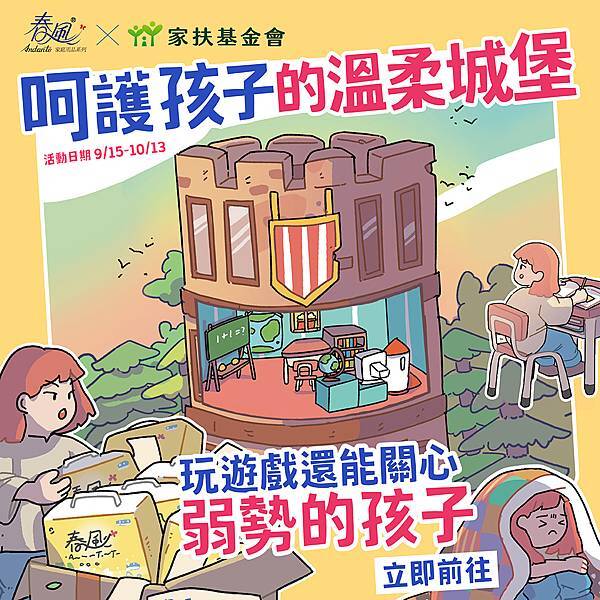「呵護孩子的溫柔城堡」為一款在春風LINE官方帳號上即可遊玩的線上遊戲,每週一主題(9/15餐廳-健康議題、9/22臥室-不當對待議題、9/29書房-教育議題、10/06露台-寄養議題),連續四週民眾可以觀察到更多弱勢孩童生活,藉由自己的愛傳遞到每個孩子的需求,春風需要透過您的互動讓溫柔城堡中的代表人物(小美)準備溫飽的三餐;也希望購過您的力量幫小美募集3位好友作為溫柔城堡衛兵,透過LINE散播出去,號召更多人一起行動支持,當然,也可以在AeSHOP上購買春風指定商品,春風衛生紙將會捐出部分所得予家扶基金會,為弱勢孩童帶來第一線的幫助。