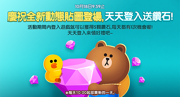 為了慶祝全新動態貼圖的登場,「LINE熊大農場」將於9月28日(二)10:00~10月18日(一)09:59期間舉辦登入活動,玩家在活動期間內每天登入遊戲都可獲得5顆鑽石(每天10:00之後為全新的一日),最多可以拿到100顆鑽石,農友們千萬不要錯過了領取優渥的獎勵。好康的活動不止如此,即將到來10月,熊大農場將會為你帶來滿滿的驚喜,大家趕快來一起開心的玩吧!