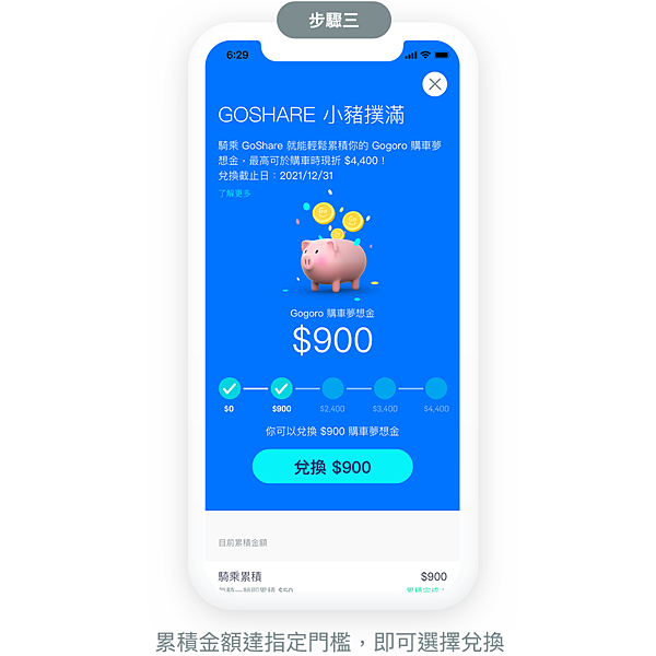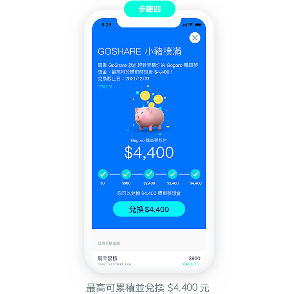 10/1 至 12/31, 只要將 GoShare App更新至 2.7.7(含)以上版本,每趟騎乘即自動累積 Gogoro 購車夢想金。點擊 GoShare App 地圖介面左上角「小豬撲滿」圖示,可查看此帳號已累積、且可兌換的 Gogoro 購車夢想金之金額。