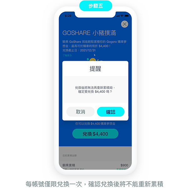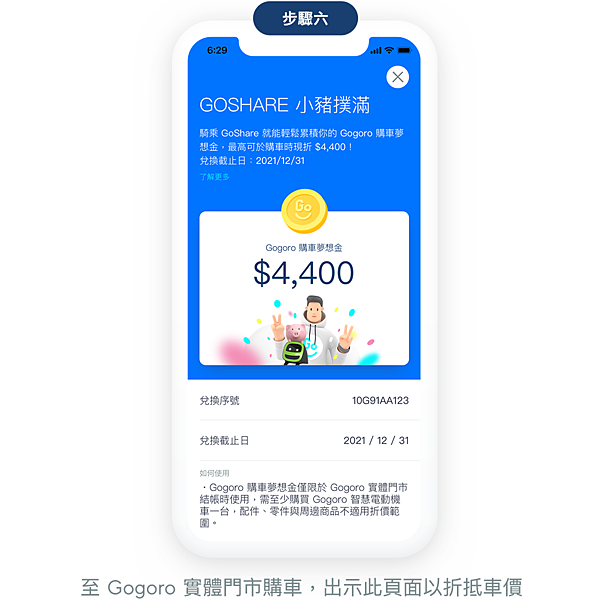 ●每個 GoShare 帳號限累積與兌換一次,於 GoShare App 內完成領取兌換序號後,將不能繼續累積 Gogoro 購車夢想金、或重新參與累積。