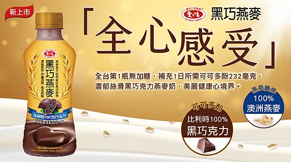 用心做最好的愛之味燕麥奶,開創黑巧克力美味新境界,推出台灣第一瓶無添加砂糖的100%比利時黑巧克力燕麥飲,補充1日所需的可可多酚232毫克-愛之味「黑巧燕麥」。