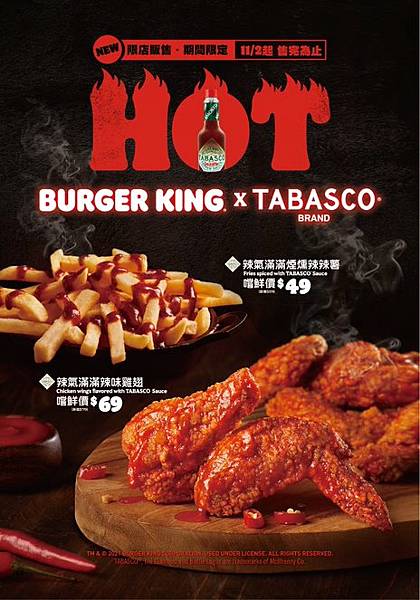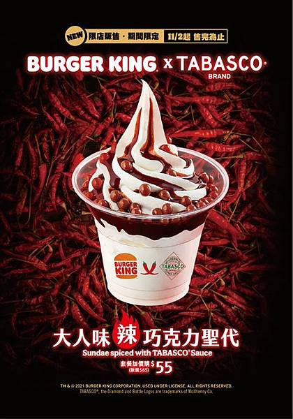 【2021年10月27日,台北訊】絕妙辣Way獨家聯名,火烤牛肉專家漢堡王今宣布(27日)與美國百年知名辣醬TABASCO首度在台獨家發表系列美味,要讓喜愛辣美味的民眾一次享受不同辣度、不同辣味帶來的驚奇體驗!漢堡王官方表示,這次與TABASCO的合作就像Soul mate!兩家品牌同樣以年輕世代消費族群為主、同樣源自美國品牌大膽創新精神、同樣追求天然食材入味,聯手研發的各種辣醬簡直與漢堡王火烤肉排、香酥脆薯、巧克力聖代、爽口雞翅神級對味!