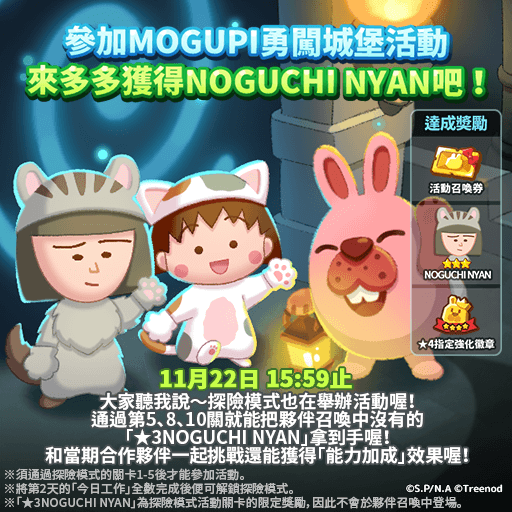 合作活動期間內,遊戲內也將推出『櫻桃小丸子貓咪版』探險模式,通過所有關卡後就可以獲得合作限定角色與活動召喚券喔!