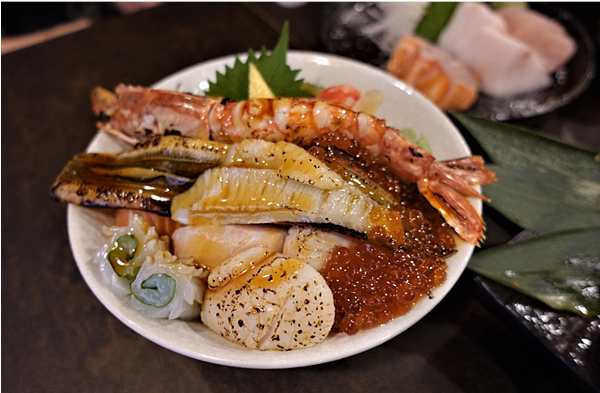 圖說/視覺衝擊的「赤鮨招牌丼/ 480元」,鮭魚、青甘、季節漁獲生魚片、干貝、比目魚、星鰻、花枝、天使紅蝦、鮭魚卵共九種海鮮一次滿足、CP值爆表,經炙燒後加倍鮮甜!