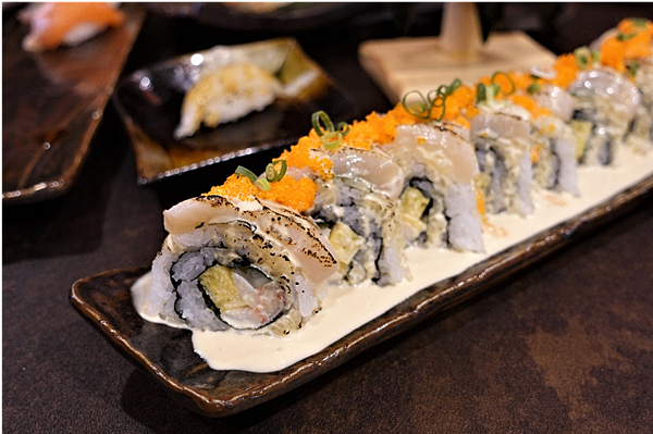 如果是喜歡嚐鮮及變化性菜單的饕客,則是推薦獨門料理-「瑪麗蓮夢露捲」裡面包了鮮蝦、小黃瓜、玉子燒、蟹肉棒,捲起後在飯上舖上日本紫蘇葉,最後再擺滿生食級干貝,干貝經過炙燒後更加鮮甜,最後再淋上「特調加州醬」、灑上蝦卵,完美的融合的不止是師傅多年的經驗和心血,更是一顆對日料充滿熱忱的心。另外,師傅也特別推薦「義式白醬烏龍麵」,日式烏龍麵卻融合進西式的作法,並且加入自製白醬與高湯、再灑上蝦卵提味,日式與西式的完美融合,絕對是讓人一吃就驚艷的美味!