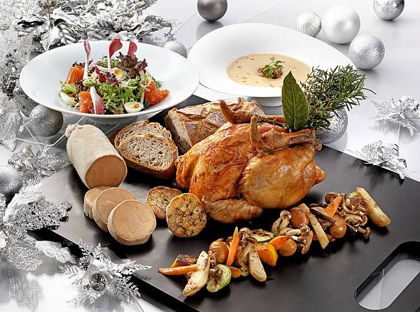 法式烤雞、碳烤季節蔬菜、法式栗子濃湯、燻鮭魚沙拉佐檸檬油醋醬、法式傳統鴨肝凍(3PC)、法式酵母麵包,建議售價4,580元。在遠百信義A13、遠百寶慶、板橋大遠百、遠百板橋中山12月10日~12月26日供應,凡訂購耶誕烤雞套餐組,贈送侯布雄帆布袋1只及6入馬卡龍禮盒1個。