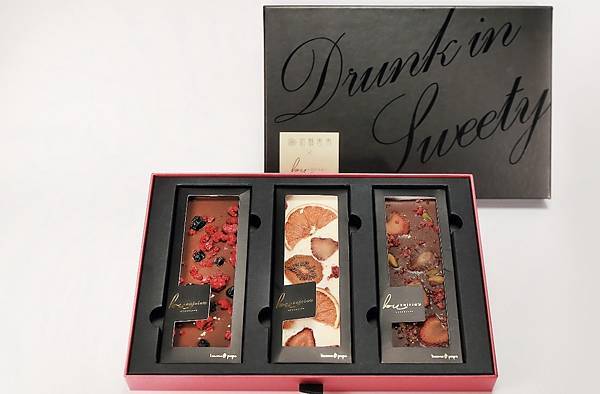*經典低糖黑巧克力:以valrhona法芙娜低糖65%巧克力為基底,搭配無糖覆盆子及藍莓果乾、最後撒上金色雪花脆片。
