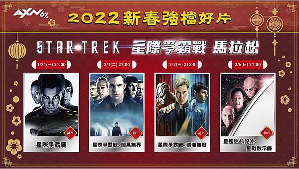 「勇踏前人未至之境(To boldly go where no man has gone before)!」,各位星際迷們準備好了嗎!AXN頻道2022新春賀歲,將為觀眾帶來經典科幻神作《星際爭霸戰》系列電影馬拉松!從除夕到初二,由大導演J.J.亞伯拉罕(J. J. Abrams)與知名編劇雙人組羅柏托奧契(Roberto Gaston Orci)、艾力克斯寇茲曼(Alex Kurtzman)聯手製作,全球最具標誌性與影響力的太空科幻強片《星際爭霸戰》(Star Trek)、《星際爭霸戰:闇黑無界》(Star Trek Into Darkness)、《星際爭霸戰:浩瀚無垠》(Star Trek Beyond)一連三集接力播出,為一系列新春強檔電影打頭陣!