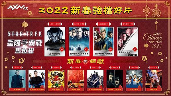 除夕至初六,AXN頻道除了為觀眾打造《星際爭霸戰》史詩級科幻視界,還有多部值得再三品味的經典卡通及日韓電影,包含除夕播出由夢工廠動畫公司出品的人氣動畫電影《功夫熊貓2》(Kung Fu Panda 2)。初一開春獻映日本最「夯」電影《強運燒肉饌》(Food Luck),由「最懂吃」的導演寺門JIMON親自操刀,講述離家出走的良人(放浪兄弟NAOTO 飾)收到疏遠多年母親病倒的消息,讓他憶起童年時在母親經營的燒肉店「根岸苑」品嘗過的幸福滋味,於是攜手最美吃貨-靜香(土屋太鳳 飾)一同踏上尋找母親的秘密食譜之旅。初二回娘家,由鄧超、劉亦菲、鄒兆龍、鄭中基領銜主演的超自然武俠三部曲最終章《四大名捕 3:大結局》(The Four Final Battle),看分散各地的四大名捕為了保護皇帝,重新聚集一同對抗邪惡陰謀。大年初三看《星際爭霸戰》導演J.J.亞伯拉罕監製的驚悚懸疑電影《科洛弗10號地窖》(10 Cloverfield Lane),體驗在有限空間中營造出的紮實與驚悚感。