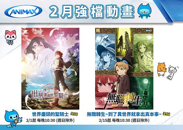 《無職轉生~到了異世界就拿出真本事~》:2/15起 每晚 10:30 (週日除外) (重播時間:隔天03:30 & 06:30 & 15:30& 22:00)